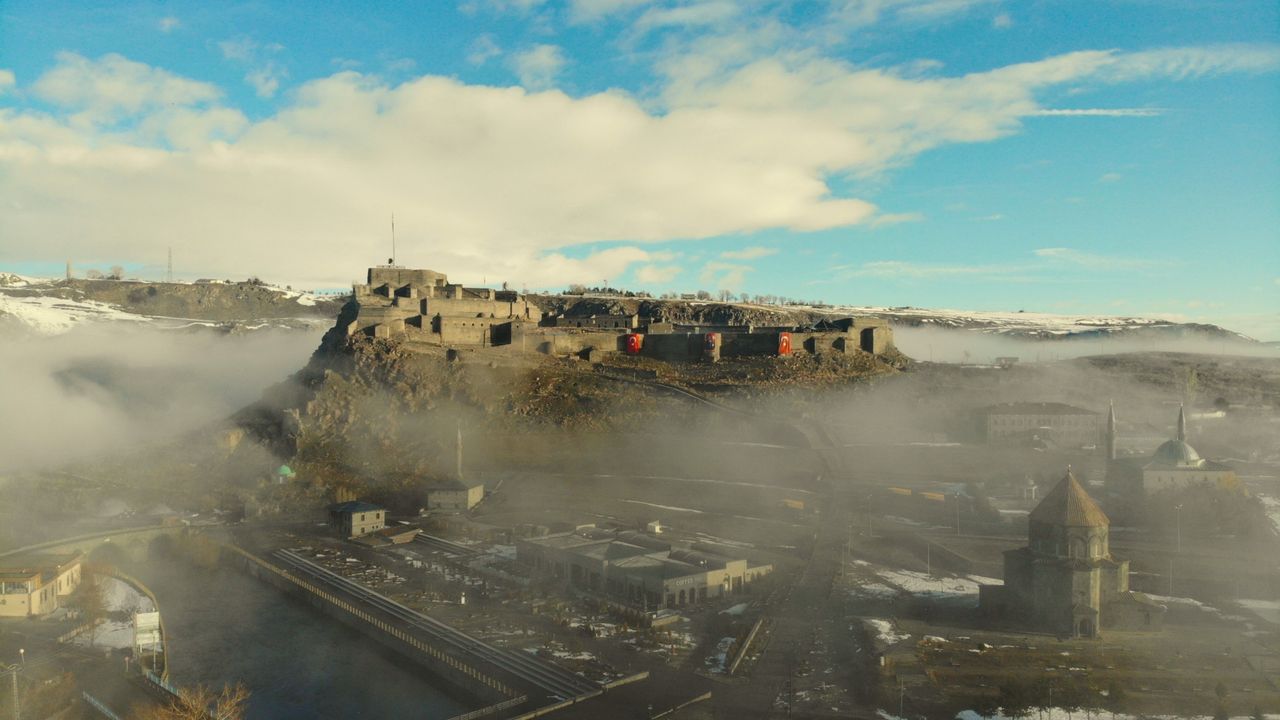 Kent merkezine hakim konumda bulunan Kars Kalesi, sis bulutlarının arasında zaman zaman görünmez hale geldi. Aynı karede yer alan tarihi kilise ve Evliya cami ise sisin arasından siluet şeklinde belirdi. Ortaya çıkan görüntüler, kentin tarihi dokusunu farklı bir atmosferle buluşturdu.
